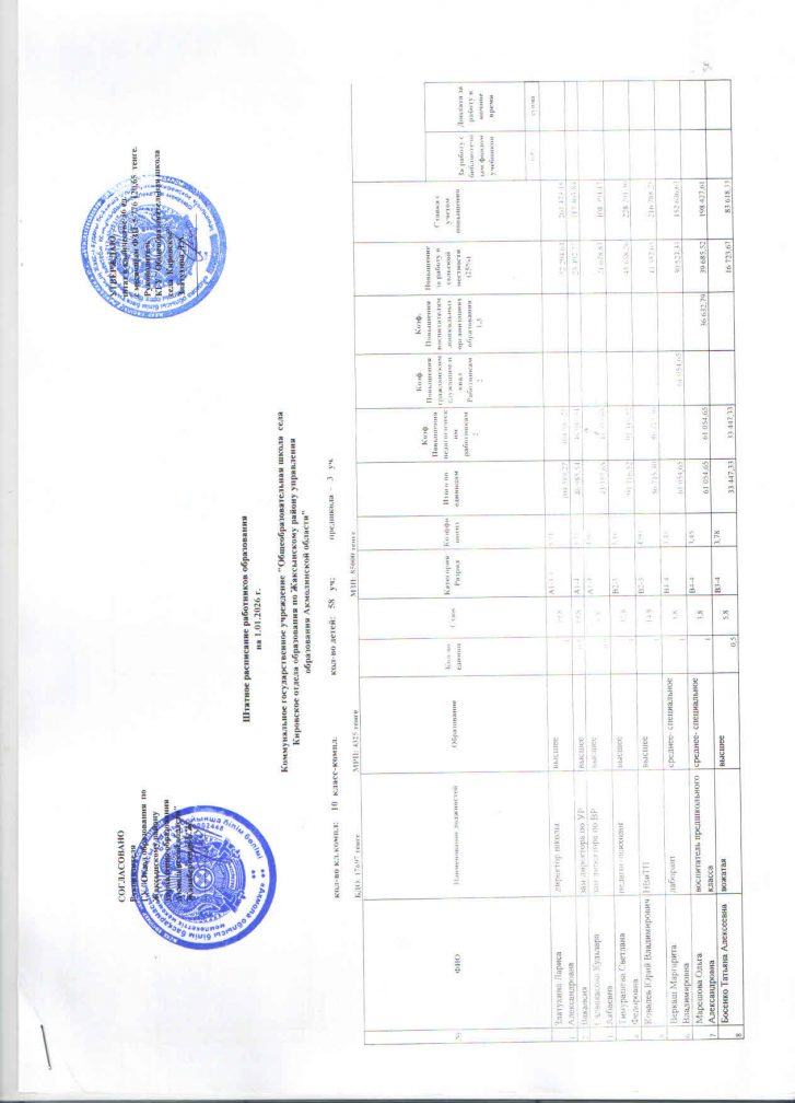 Білім беру қызметкерлерінің штат кестесі 01.09.2023 ж.